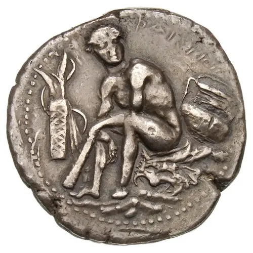 | Descrição do anverso | Heracles seated left atop lion`s skin draped over rock, head slightly right, club resting against left leg; before him, tree upon which is hung his bow and quiver; behind, large amphora. |