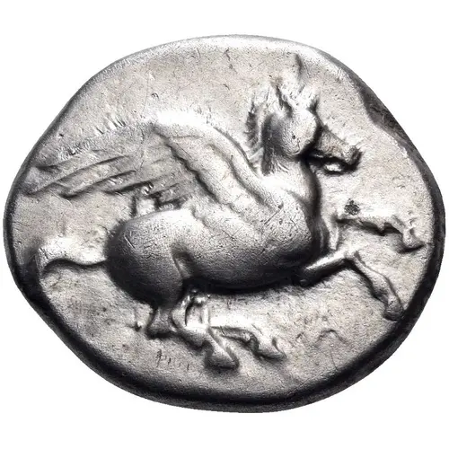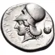 Head of Athena to left, wearing Corinthian helmet; behind, chelys.