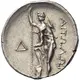| Reverse description | Aitolos, naked but for chlamys, standing left with causia slung on back, resting right foot on rock and holding spear in right hand and sword under left arm. In left field, Δ. |