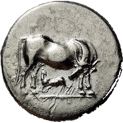 | Description de l’avers | Cow standing right, her head bent back to left to suckle her calf, kneeling left beneath her |