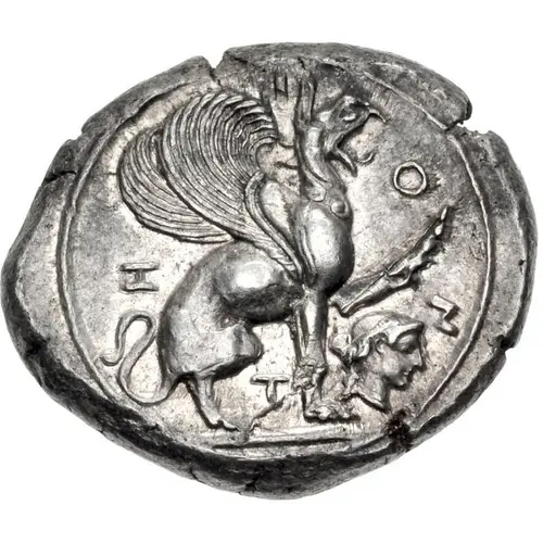 | توضیحات روی سکه | Griffin seated right, raising left forepaw, on ground line; below forepaw, head of female right; T-H-I-O-N around. |
