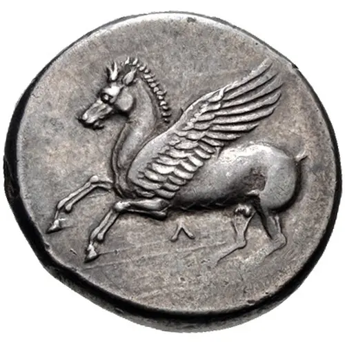 Mô tả mặt trước Pegasus facing left with the letter Λ below.