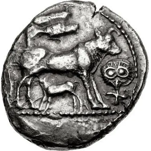 | Mô tả mặt sau | Bull standing right, head facing; plow above, facing head of owl below; all within shallow incuse square. |