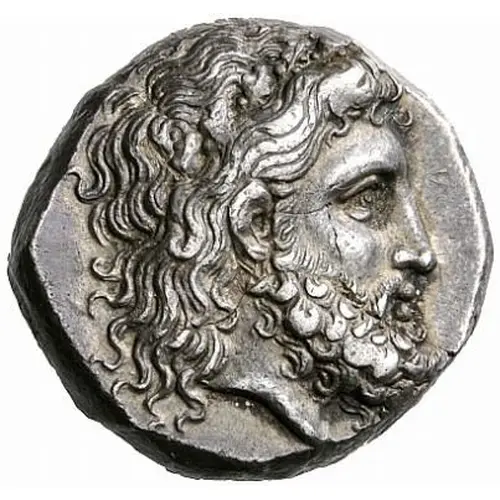 | Popis líce | Bearded head of Zeus Dodonaios to right, wearing oak wreath. |