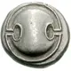 | Opis rewersu | Amphora; dolphin left above, magistrate name across field; all within incuse concave circle. |