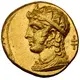 Draped bust of Aphrodite left, wearing crown with five semi-circular plates, taenia, beaded hoop earring, and torque, seen from front, hair flowing in ringlets behind and one long curl across cheek. |