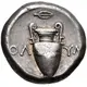 | Reversbeschreibung | Amphora; spearhead right above, magistrate name across field; all within incuse concave circle. |