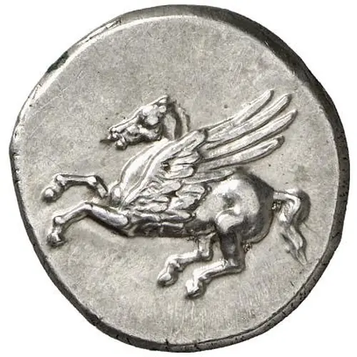| Reversbeschreibung | Head of Athena to left, wearing Corinthian helmet, below chin, Γ and ? behind her head, youthful head of Acheloos facing left |