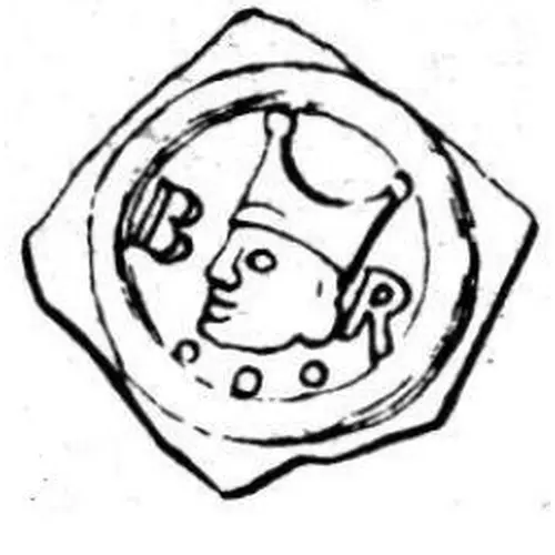 Beschrijving voorzijde Mitred head of bishop facing. B R in fields.