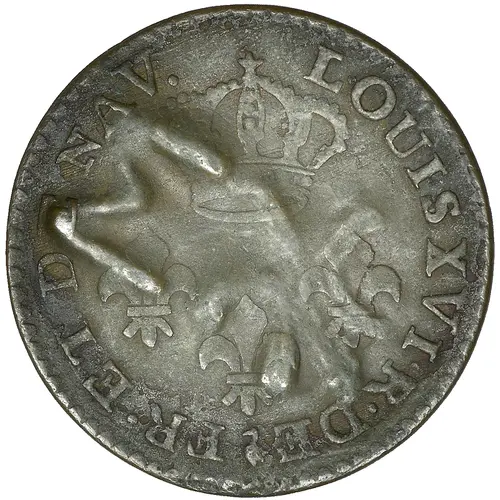 | Popis líce | Countermark M and fleur-de-lis on Cayenne Colony 2 Sous piece, which displays a crown above three fleur-de-lis surrounded by legend. |