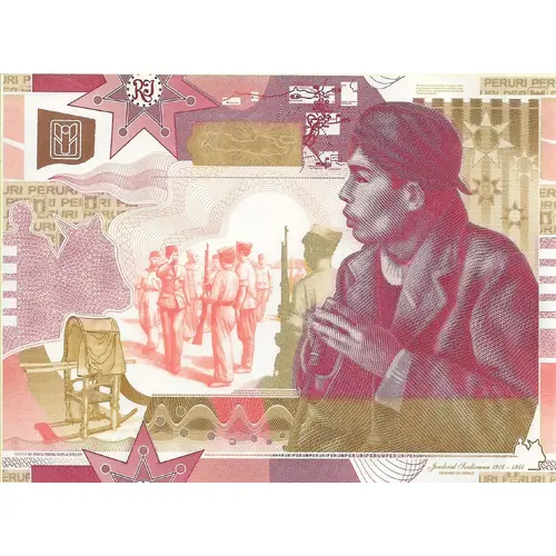 This image is a *specimen security print* by *Perum Peruri* (Indonesia’s state-owned security printing company), featuring an artistic depiction of *General Sudirman* (1916–1950), a revered Indonesian national hero and military leader. # Key Features of the Design: 1. *Portrait of General Sudirman*: - On the right side of the print, there is a detailed illustration of *General Sudirman* holding a cane. Despite suffering from tuberculosis, he famously continued to lead guerrilla warfare against colonial forces, symbolizing resilience and unwavering dedication. - His focused expression reflects determination and the spirit of Indonesia`s fight for independence. 2. *Military Scene*: - In the background, there is an illustration of Indonesian soldiers standing in formation during a military drill or assembly, highlighting Sudirman`s role as the first Commander-in-Chief of the Indonesian National Armed Forces. - The depiction emphasizes themes of discipline, unity, and patriotism. 3. *Stretcher (Tandu) in the Bottom Left*: - At the bottom left, there is an image of a *stretcher (tandu)*, symbolizing a significant moment in General Sudirman`s history. - This stretcher reflects the period when Sudirman, despite being gravely ill, was carried through jungles and mountains to lead guerrilla campaigns, showcasing his extraordinary dedication to Indonesia’s independence. 4. *Map of Java in the Upper Center*: - A map of *Java Island* appears in the upper center of the design, highlighting key locations tied to the revolutionary struggle and Sudirman`s military campaigns. - This reinforces his strategic importance and contributions during the Indonesian National Revolution. 5. *National Symbols and Security Features*: - A star emblem with the letters `RI` (Republik Indonesia) represents national identity and pride. - The background includes security patterns, wavy lines, and abstract designs for authenticity and anti-counterfeiting measures. 6. *Color Scheme*: - Dominated by shades of *red, maroon, and beige*, the color palette symbolizes courage, sacrifice, and national pride. - Golden detailing adds richness and enhances the intricate design elements. 7. *Text and Honors*: - At the bottom right, the inscription `Jenderal Soedirman 1916–1950` commemorates his significant role and enduring legacy in Indonesia’s history. - The word `PERURI` appears repeatedly across the background as part of the security design. --- This design honors the *legacy of General Sudirman*, capturing his determination, leadership, and enduring symbol of Indonesia’s struggle for independence. The inclusion of the stretcher and the map of Java deepens the historical significance of this piece, reflecting his sacrifice and strategic contributions. |
