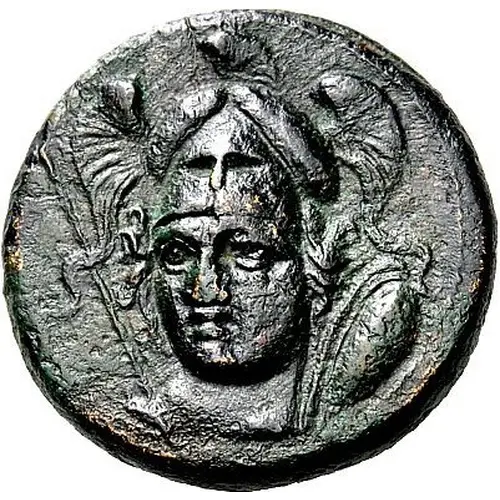 Popis líce Helmeted head of Athena Parthenos facing, turned slightly to the left, with shield over her left shoulder and spear over her right