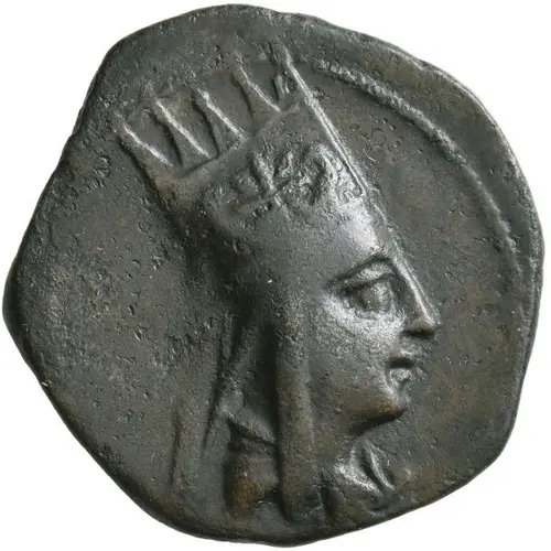 Draped bust of Antiochos I to right, wearing tiara of Tigranes II of Armenia.