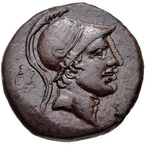 Obverse description Helmeted head of Ares facing right.