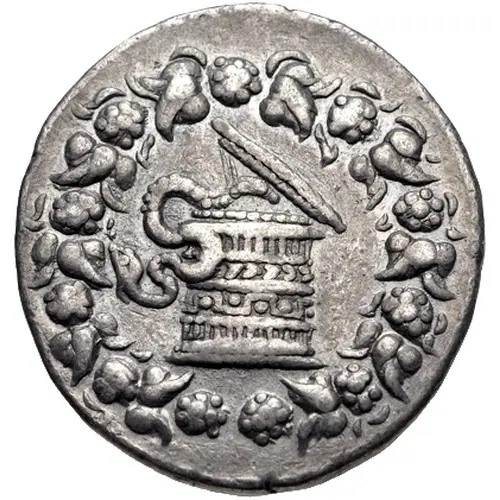 | Beschrijving voorzijde | Cista mystica with serpent. All within an ivy wreath. |