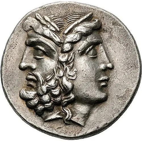 | توضیحات روی سکه | Janiform head composed of a laureate and bearded head of Zeus to left and a diademed head of Hera to right |