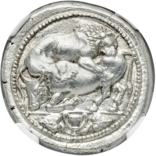 | Ön yüz açıklaması | Lion right, attacking bull kneeling to left and biting into his hind quarters. In exergue, cantharus between two ivy leaves pointed outward. |