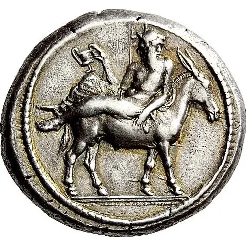 Описание аверса Dionysos, wearing ivy wreath and himation and with his head turned forward, reclining on a donkey walking to right. He holds, with his right hand, a kantharos, propped on his right knee, and rests his left hand on the donkey’s side