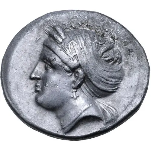 | توضیحات روی سکه | Head left of Kore-Soteira, wearing pendant earring, necklace, sphendone and wreath of grain ears, with hair wrapped in broad band. |