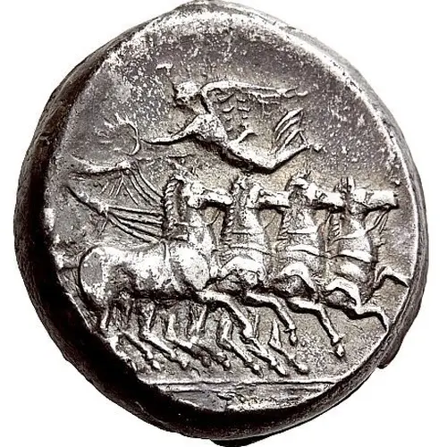| توضیحات روی سکه | Charioteer, holding a kentron in his right hand and the reins of two horses in each hand, driving quadriga galloping to the right. Above, Nike flying left to crown the charioteer and in exergue, a grain ear. |