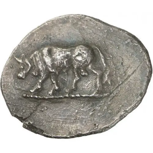 | Description de l’avers | Bull walking to left, its head lowered, on ground line. |