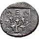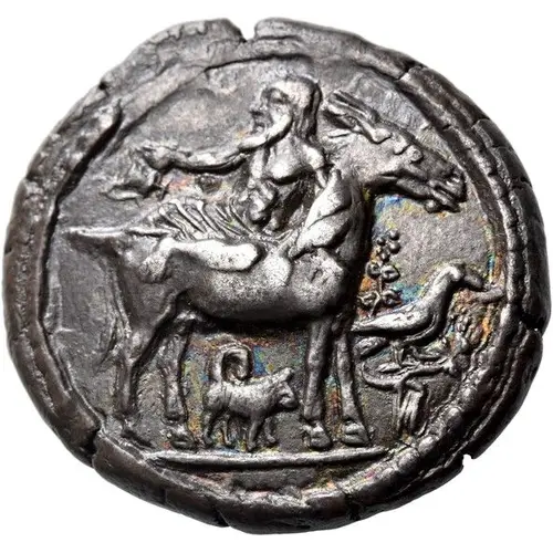 | Ön yüz açıklaması | Dionysos, bearded, with his head to left, wearing an ivy wreath and a chiton, reclining to right on the back of a donkey walking to right, holding a kantharos with his right hand and resting his left on the donkey`s side; to right, crow perched on an ivy plant to right; under the donkey, small dog standing to right. |