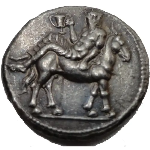 | Descripción del anverso | Dionysus holding a kantharos in extended right hand, reclining left on back of ass walking right. |