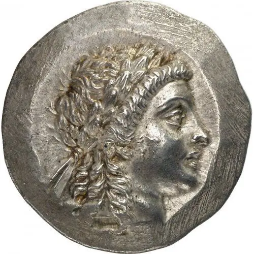 | توضیحات پشت سکه | Apollo Grynios standing right, holding branch and phiale; monogram to left, omphalos and amphora at feet; all within laurel wreath. |