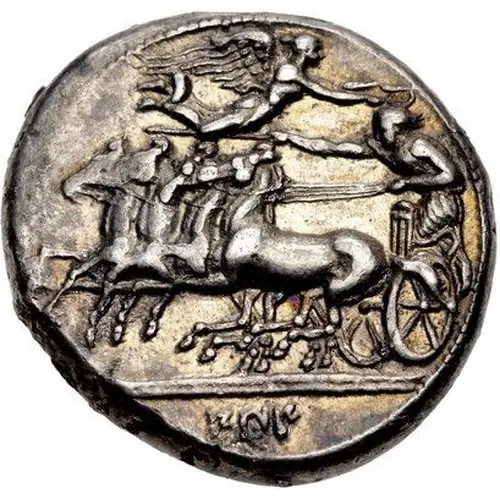 Описание аверса Charioteer, holding kentron in extended right hand, reins in left, driving fast quadriga left; above, Nike flying right, crowning charioteer with wreath she holds with both hands; in exergue, Punic ZIZ and dolphin leaping left.