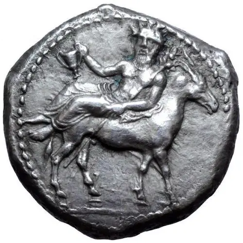 表面の説明 Dionysos, head facing, holding a kantharos in his right hand and thyrsos in his left, reclining on donkey walking to right.