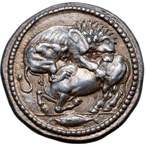 | Obverse description | Lion to right, leaping upon and attacking bull with head up to left; in exergue, fish to left. |