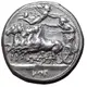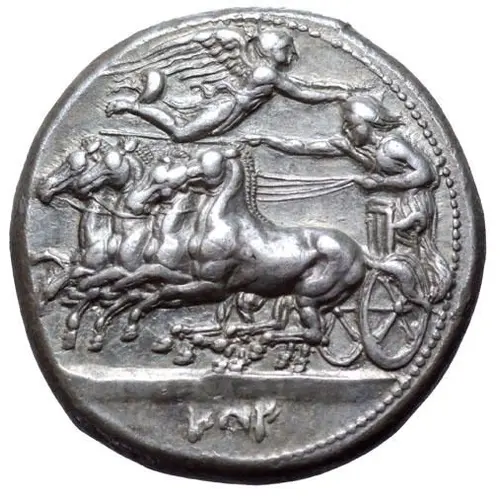 | Descrizione del dritto | Charioteer holding kentron and reins, driving galloping quadriga to left; Nike flying above to crown charioteer; Punic script `ṢYṢ` (Ziz) below exergual line. |