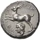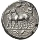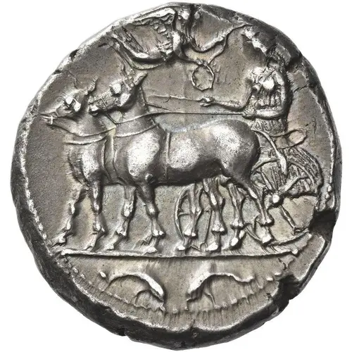 | Description de l’avers | Slow biga of mules driven left by Messana, wearing long chiton and holding reins in both hands and kentron in right; above, Nike flying right to crown her. In exergue, two dolphins swimming snout to snout. |