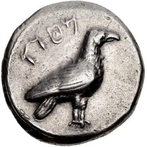 Obverse description Eagle standing right; MṬV’ (in Punic) above.