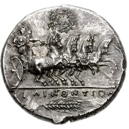 | Obverse description | Nike, holding reins in her left hand, in galloping quadriga, facing right. Laurel wreath above her and a grain ear in exergue |