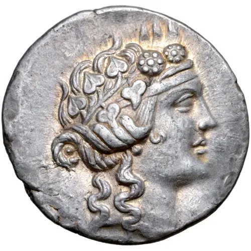 | Obverse description | Head of youthful Dionysos to right, wearing ivy wreath. |