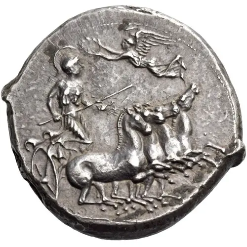 | توضیحات روی سکه | Fast quadriga driven right by helmeted Athena, holding reins and kentron; above the horses Nike flying left to crown her. In exergue, barley grain. |