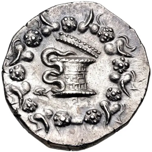 | Obverse description | Serpent atop cistica mystica, surrounded by ivy wreath. |