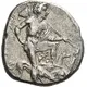 | Descrição do anverso | Aegestes, the city`s founder, as hunter, standing right with left foot upon rock, right hand resting on hip, left elbow on knee; he wears a pilos suspended behind the neck, sword hanging from strap around left shoulder, ankle-boots (cothurni) and chlamys over left arm; two javelins in left hand. At his feet, two hounds right and in right field, ithyphallic herm left, wearing petasus. |