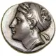 | Descripción del anverso | Head left of Kore-Soteira, in sphendone and with hair wrapped in broad band, wearing button earring with conical pedant and beaded necklace. |