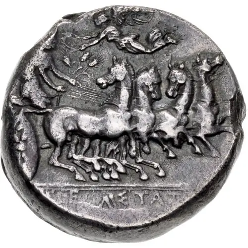 | Descrição do anverso | Aigiste, holding grain ear in right hand and reins in both, driving fast quadriga right; above, Nike flying left, crowning her with wreath; in exergue, ΣE-ΛEΣTAZIA above grasshopper right. |