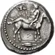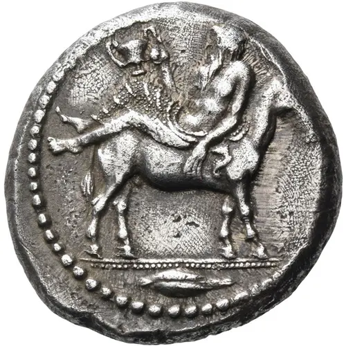 | Описание аверса | Dionysos, bearded and wearing a decorated himation, holding kantharos in his right hand and letting his left dangle, reclining left on the back of a donkey walking to right; in the exergue, grain of barley |