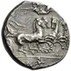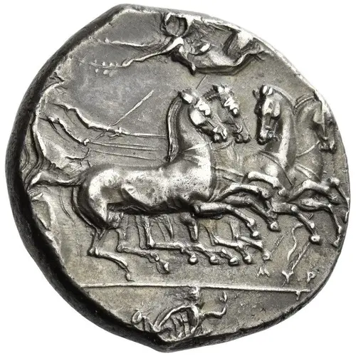 | Descrição do anverso | Fast quadriga driven right by charioteer holding kentron and reins; above, Nike flying left, holding wreath and below, MYP. In exergue, Scylla right. |