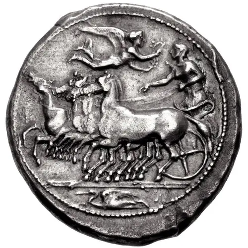 | Aversbeschreibung | Athena, holding reins in both hands, driving galloping quadriga left; above, Nike flying right, presenting to Athena an open wreath held in both hands; in exergue, heron flying left. |
