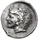 | Reversbeschreibung | Bearded head of Herakles left, wearing lion skin; KAMAPINAI-ON to left. |