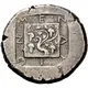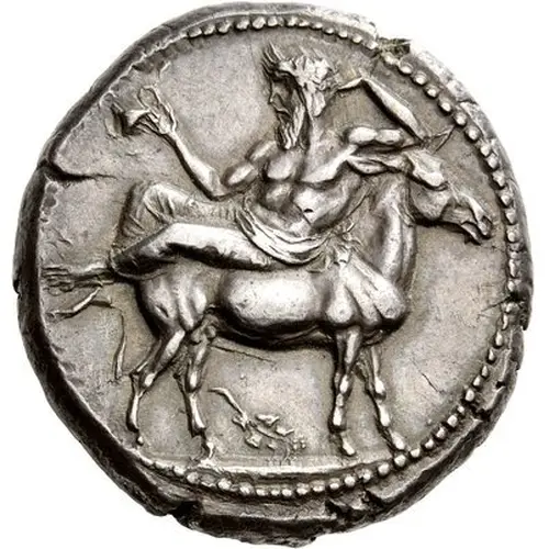 Descrição do anverso Dionysos, bearded and wearing ivy wreath and himation, holding a kantharos in his right hand, resting his left on his head, and reclining left on the back of a donkey walking right. Below donkey, sprig of ivy