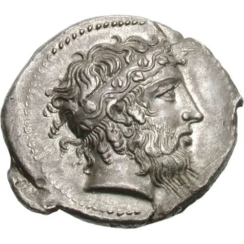 | Obverse description | Head of Dionysus right, wearing taenia decorated with ivy-tendrils, hair and beard in loose array. |