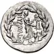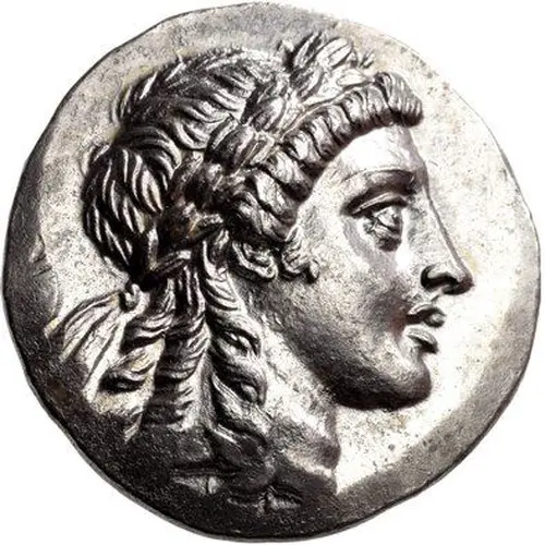 | Reversbeschreibung | Apollo Grynios standing right, holding branch and phiale; monogram to left, omphalos and amphora at feet; all within laurel wreath. |