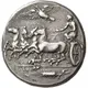 Descripción del anverso Fast quadriga driven left by charioteer holding kentron and reins; above, eagle flying left and, in exergue, ear of barley left.