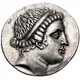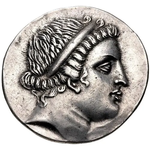 | Mô tả mặt trước | Head of the nymph Cyme right, hair bound with taenia. |